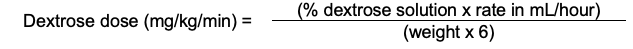 - Dextrose 10%, continuous IV infusion, 6–12 mg/kg/minute or more.